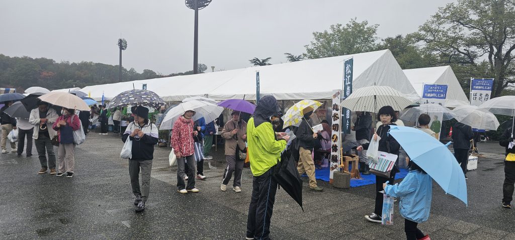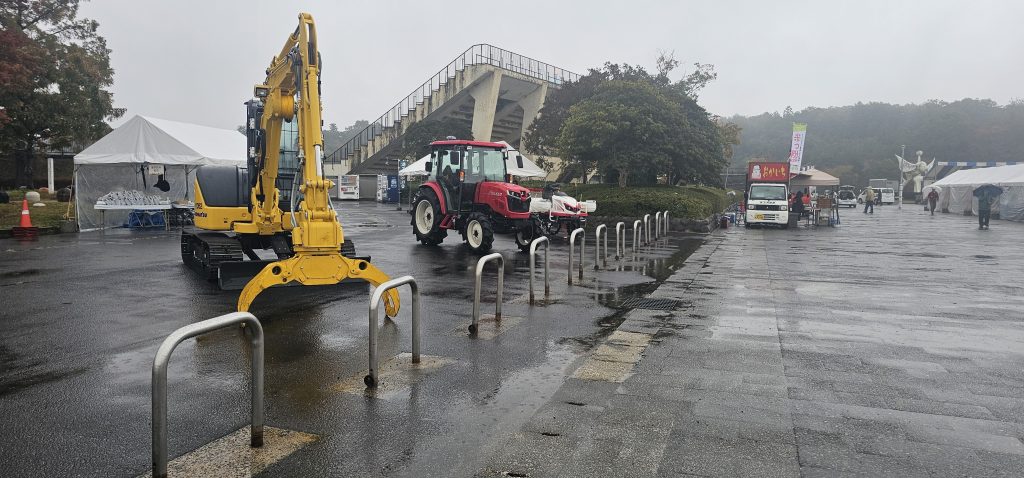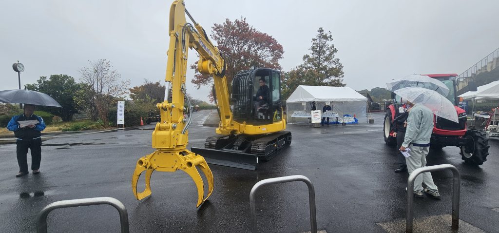 午前中は、あいにくの雨模様にもかかわらず、たくさんのお客様に来場いただき、普段見ることのない林業用機械を見ていただく機会をいただけて、弊社としても大変嬉しく思っております。